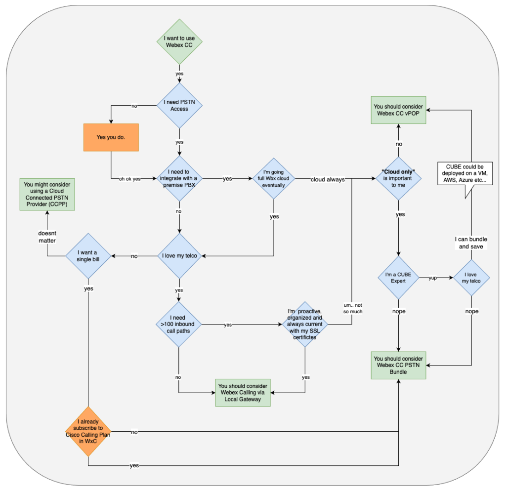 There are lots of options when it comes to connecting PSTN. This is great from the perspective of design and flexibility, but all the options can be daunting and some have drawbacks others don’t so it’s important to talk through what your requirements are heading into it because you can only have one method of PSTN integration. This decision tree has the question I most look for when choosing the right PSTN option for customers. This article does great at showing some of the basics around each option as well – Set Up Voice Channel for Webex Contact Center.