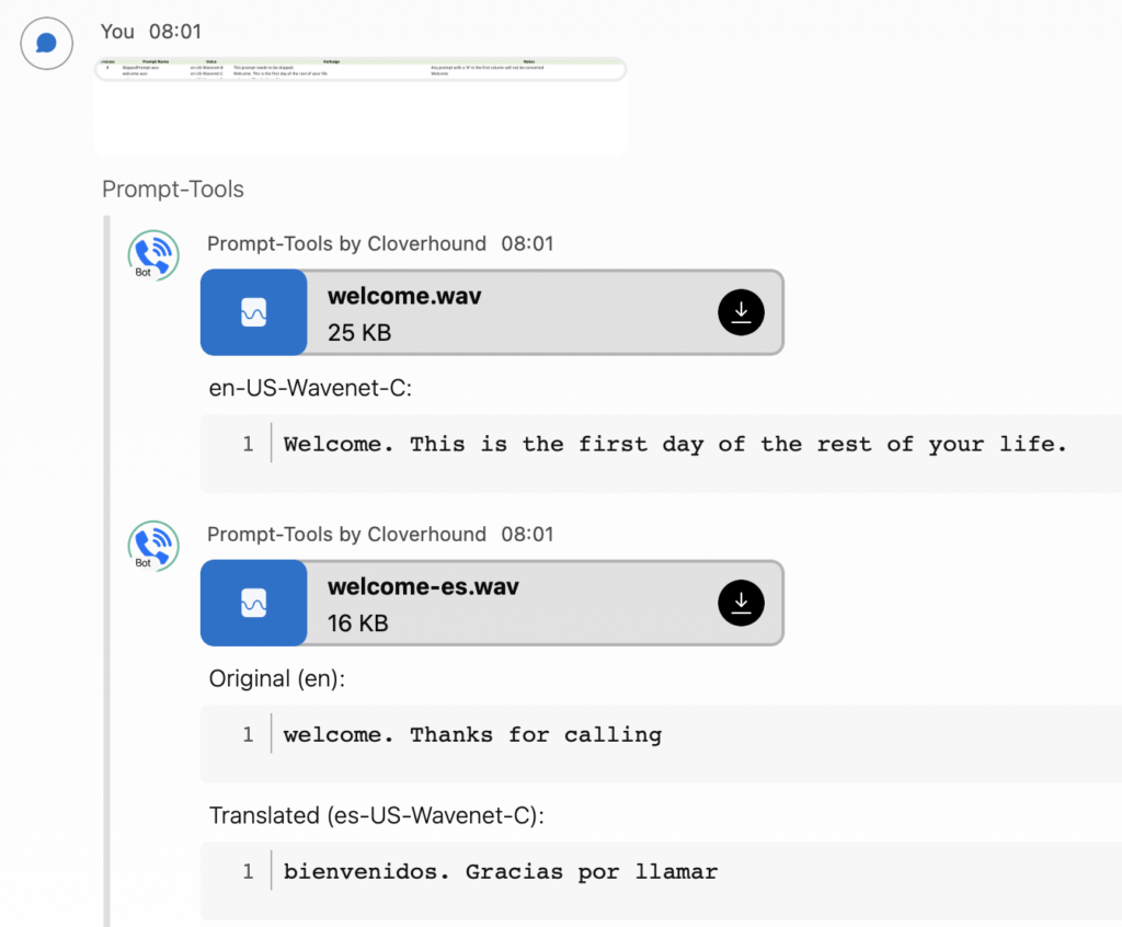 We also transcribe prompts which can be a huge help with doing discoveries or migrating between systems. You could transcribe the existing prompts and use that to generate the new prompts or let the BOT translate prompts for you so you understand what is being asked out of the system. Similar to the Bulk task, just upload the WAV files and the BOT will take care of the rest. You can upload multiple WAV files at a time to speed things up and the BOT will process through each of them.