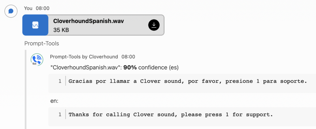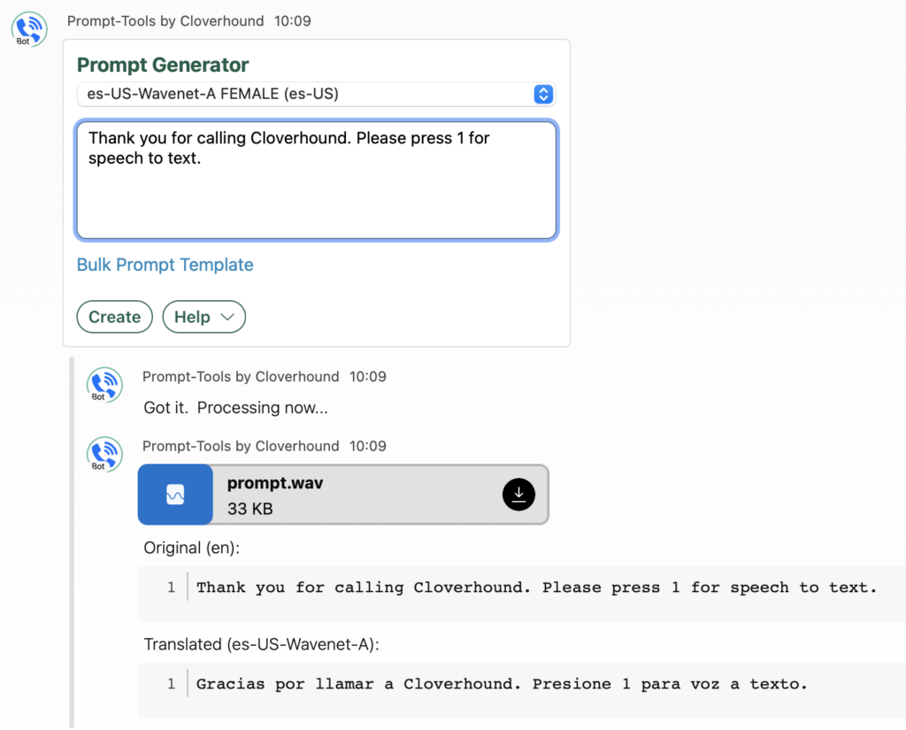 In order to create a prompt in another language, simply select a voice in the language you need. The BOT will detect the original language and translate it to the target language producing the prompt. This is great for creating menus in different languages without being fluent in it.