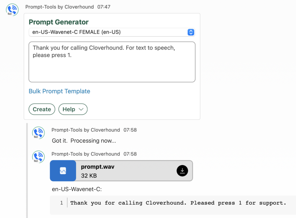 Creating prompts is as easy as selecting the voice you want to use and putting in what you want it to say. The BOT processes SSML as well so you can get creative with it and tweak the prompt to sound like you intend.