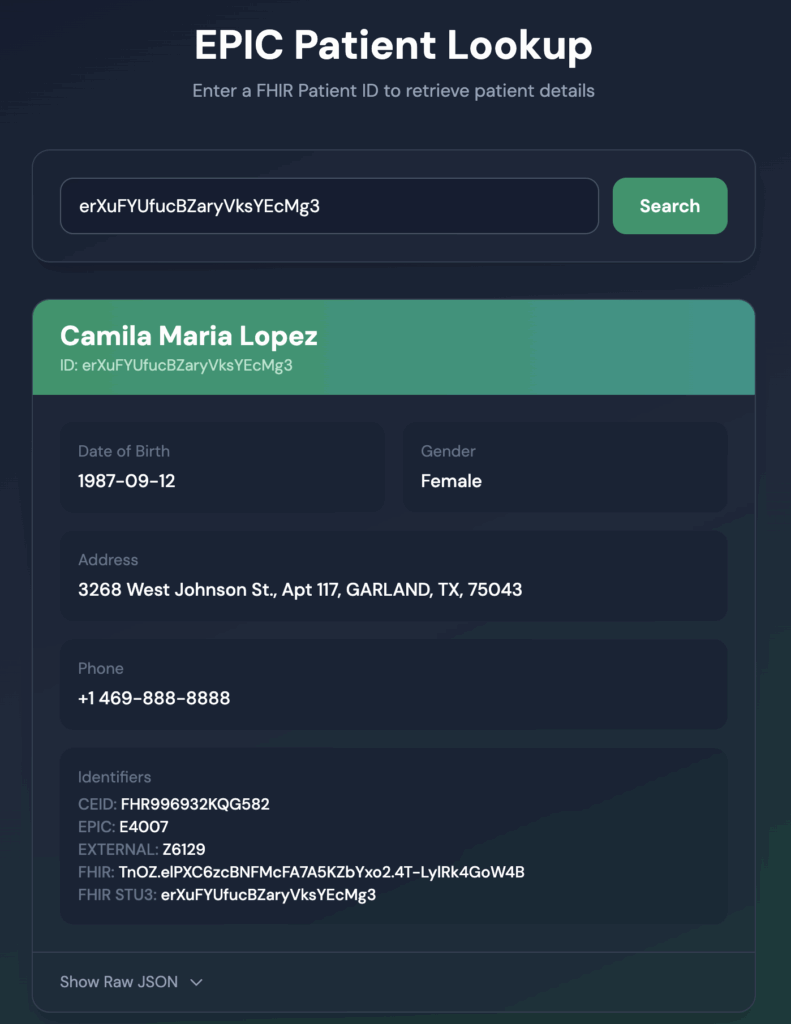 “I would like a barebones Javascript and HTML file that let’s me look up a patient from EPIC given a FHIR ID and display details about them. I would like a small config file where I can put my information. This is going to use a Backend OAUTH flow. Use tailwind for the front end.”