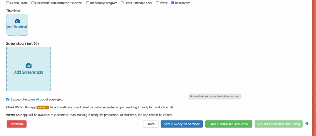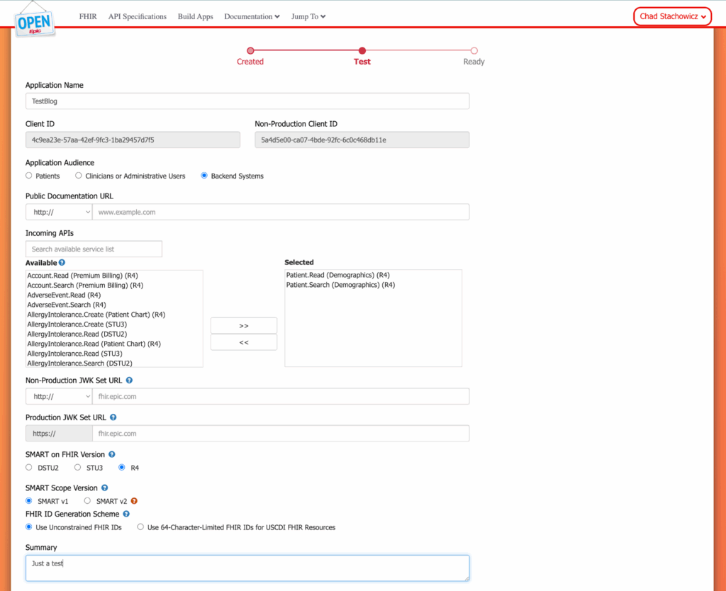 This will allow us to use our Non-Production Client ID above, for working with the EPIC Sandbox. For actual clients to use it… even for their sandbox, you must do ‘Save & Ready for Production’. At that point, organizations using EPIC can search your production Client ID and download the app for use, EVEN IF IT IS NOT YET ON SHOWROOM. Showroom allows them to search and download apps by name, but it is not a requirement for a hospital to use the apps that you have built. There is a lot of great information here for getting started that I might not answer: Documentation – Epic on FHIR.