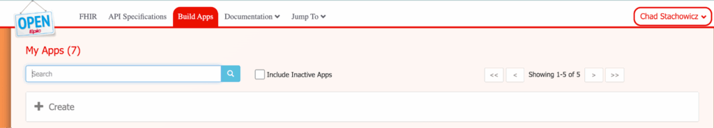 Once you do that and are logged in to EPIC on FHIR you will see the following menu. We are going to click Build Apps -> Create to make our App.